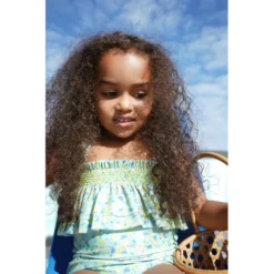 Swimsuit made in 80 percent recycled polyester and 20 percent elastane. Designed with frills and ruffled straps. The stretchy fabric protects against the sun’s UV rays with the highest ultraviolet protection factor, UPF 50+.