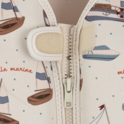 Float vest made in 80% neoprene and 20% polyester lining. Designed with both zipper and velcro closure. Features a buckled safety crotch strap so that your child can never slip out of the vest.