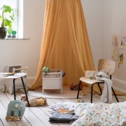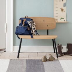 The Oakee bench is a small children’s bench in minimalist design that matches the Oakee table and chair from the same series. The Oakee bench has four powder-coated metal legs in matte black and a beautiful seat and backrest in oak veneer. The bench has rounded, curved corners and will look great in the nursery, but can also be used in the hall so that your child has a place to sit when practicing putting on its shoes or rubber boots.
