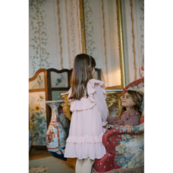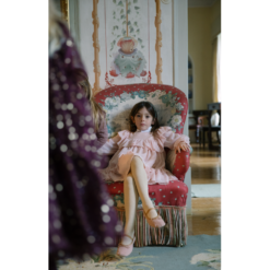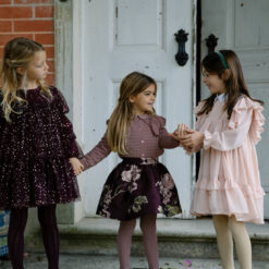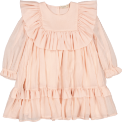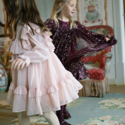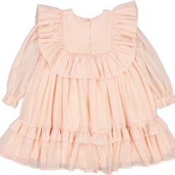 Dress with full volume and glitter crepe details. The dress has inner ligning and button closure at the back. The length of the dress goes to above the knee